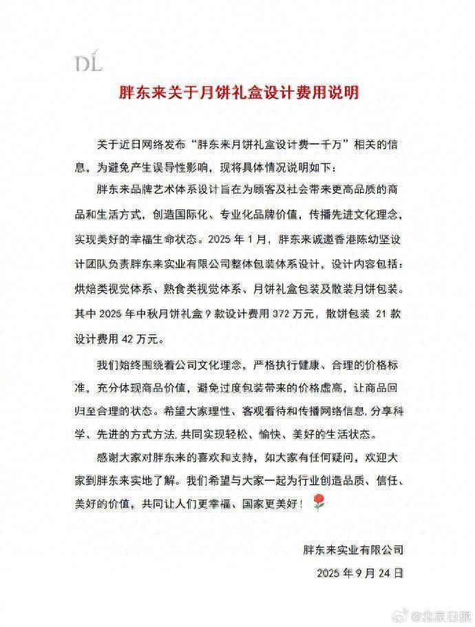 胖东来品牌艺术体系设计旨在为顾客及社会带来更高品质的商品和生活方式,创造国际化、专业化品牌价值,传播先进文化理念,实现美好的幸福生命状态。2025年1月,胖东来诚邀香港陈幼坚设计团队负责胖东来实业有限公司整体包装体系设计,设计内容包括:烘焙类视觉体系、熟食类视觉体系、月饼礼盒包装及散装月饼包装。其中2025年中秋月饼礼盒9款设计费用372万元,散饼包装21款设计费用42万元。